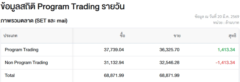 ผู้สื่อข่าวรายงานว่า วันนี้ (20 มี.ค.69) ตลาดหลักทรัพย์แห่งประเทศไทย (ตลท.) เปิดเผยข้อมูลซื้อขายรายวันผ่าน Program Trading หรือ “โปรแกรมโรบอทเทรดดิ้ง” พบว่ามีมูลค่าซื้อจำนวน 37,739.04 ล้านบาท และมูลค่าขายจำนวน 36,325.70 ล้านบาท เท่ากับซื้อสุทธิ 1,413.34 ล้านบาท