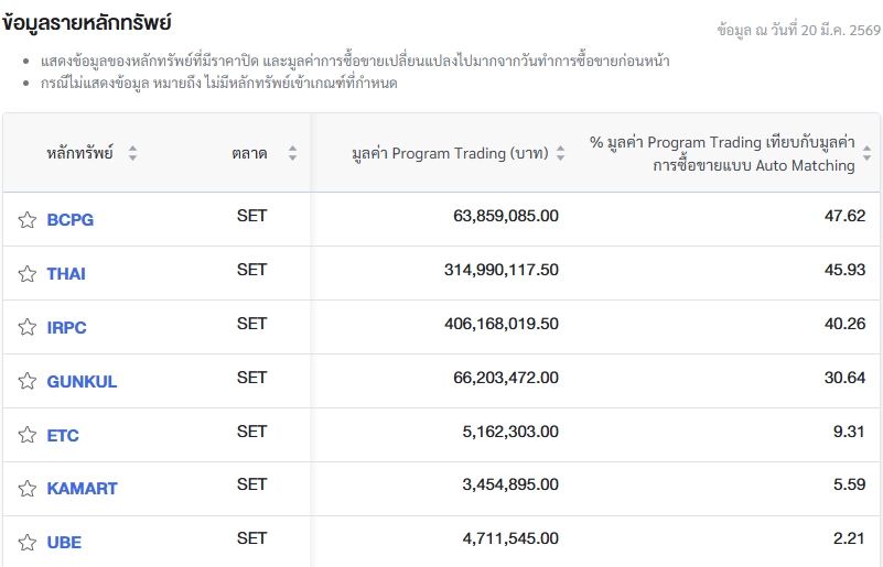 นอกจากนี้ ตลาดหลักทรัพย์แห่งประเทศไทย (ตลท.) รายงานข้อมูลหลักทรัพย์ที่มีการซื้อขายผ่านระบบ Program Trading สูงสุด โดยพิจารณาจากสัดส่วนมูลค่า Program Trading เทียบกับมูลค่าการซื้อขายแบบ Auto Matching พบว่ามี หลักทรัพย์ที่มีการทำรายการสูงสุดในวันนี้ ได้แก่