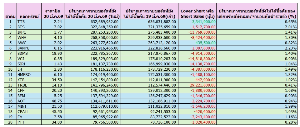 เปิด 20 อันดับหุ้นถูก “Cover-Short” สูงสุด ณ 20 มี.ค.69