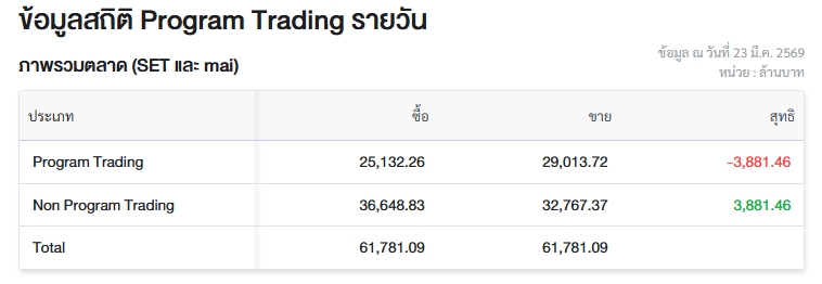 ผู้สื่อข่าวรายงานว่า วันนี้ (23 มี.ค.69) ตลาดหลักทรัพย์แห่งประเทศไทย (ตลท.) เปิดเผยข้อมูลซื้อขายรายวันผ่าน Program Trading หรือ “โปรแกรมโรบอทเทรดดิ้ง” พบว่ามีมูลค่าซื้อจำนวน 25,132.26 ล้านบาท และมูลค่าขายจำนวน 29,013.72 ล้านบาท เท่ากับขายสุทธิ 3,881.46 ล้านบาท