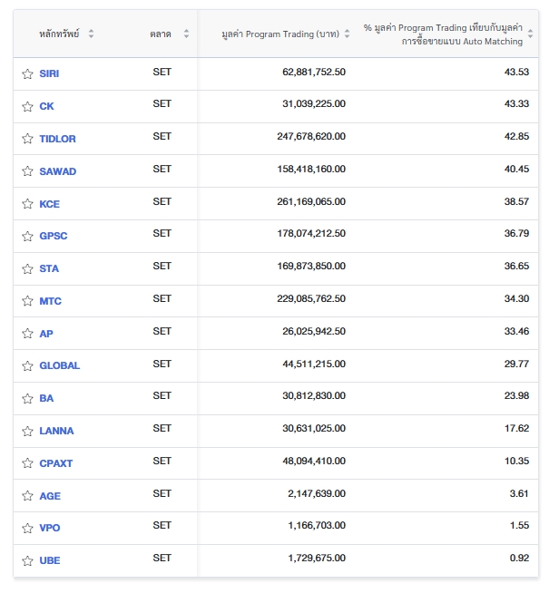 นอกจากนี้ ตลาดหลักทรัพย์แห่งประเทศไทย (ตลท.) รายงานข้อมูลหลักทรัพย์ที่มีการซื้อขายผ่านระบบ Program Trading สูงสุด โดยพิจารณาจากสัดส่วนมูลค่า Program Trading เทียบกับมูลค่าการซื้อขายแบบ Auto Matching พบว่ามี หลักทรัพย์ที่มีการทำรายการสูงสุดในวันนี้ ได้แก่