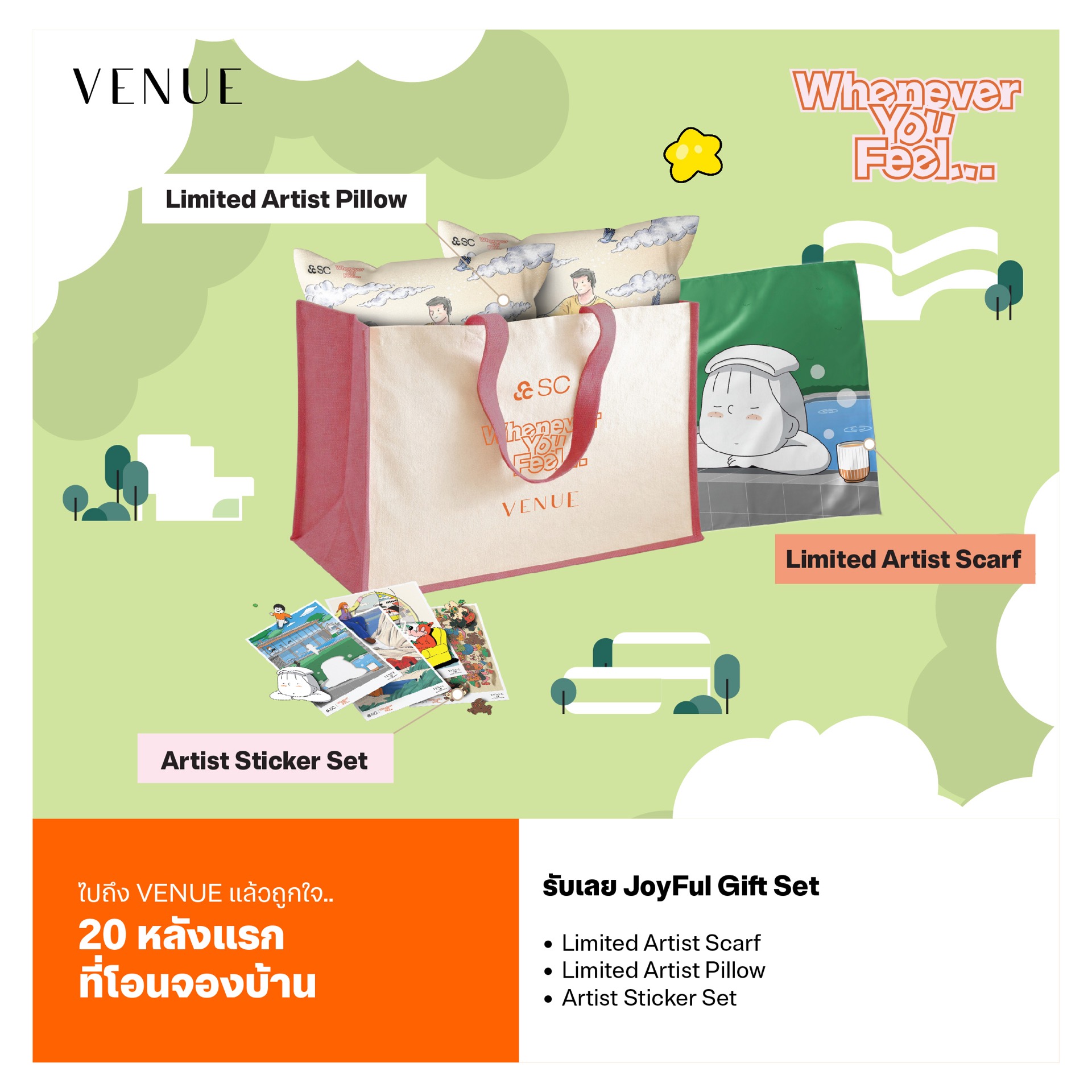 นอกจากนี้ SC ยังได้ขยายประสบการณ์แห่งการอยู่อาศัยผ่านกิจกรรม “SCbition” โดยนำผลงานของ 14 ศิลปินไปจัดแสดงในร้านกาแฟ (Cafe) จำนวน 4 แห่ง เพื่อให้ผู้สนใจได้เข้าถึงผลงานศิลปะอย่างใกล้ชิด ได้แก่ ระหว่างวันที่ 25 มีนาคม – 6 เมษายน 2569 ที่ร้าน Dawn to Dusk ซอยกรุงเทพกรีฑา 20 และร้าน TYBS Coffee Bar ย่านบางใหญ่ ส่วนระหว่างวันที่ 7 – 19 เมษายน 2569 จัดแสดงที่ร้าน Horme cafe Nonthaburi ซอยไทรม้า และร้าน San Rafael ย่านบางแค โดยผู้ที่จองซื้อบ้าน 20 หลังแรก จะได้รับสิทธิพิเศษ (Limited Edition) จำนวน 3 รายการ ได้แก่ 1. ชุดโปสการ์ดลายพิเศษจาก 15 ศิลปิน 2. หมอนลายพิเศษจำนวน 2 ใบ และ 3. ผ้าพิมพ์ลายคลุมไหล่ 1 ผืน โดยแคมเปญดังกล่าวจัดขึ้นตั้งแต่วันนี้ถึงวันที่ 30 มิถุนายน 2569 ผู้ที่สนใจสามารถดูรายละเอียดเพิ่มเติมได้ที่เว็บไซต์ของโครงการ (https://online.scasset.com/wheneveryoufeel)
