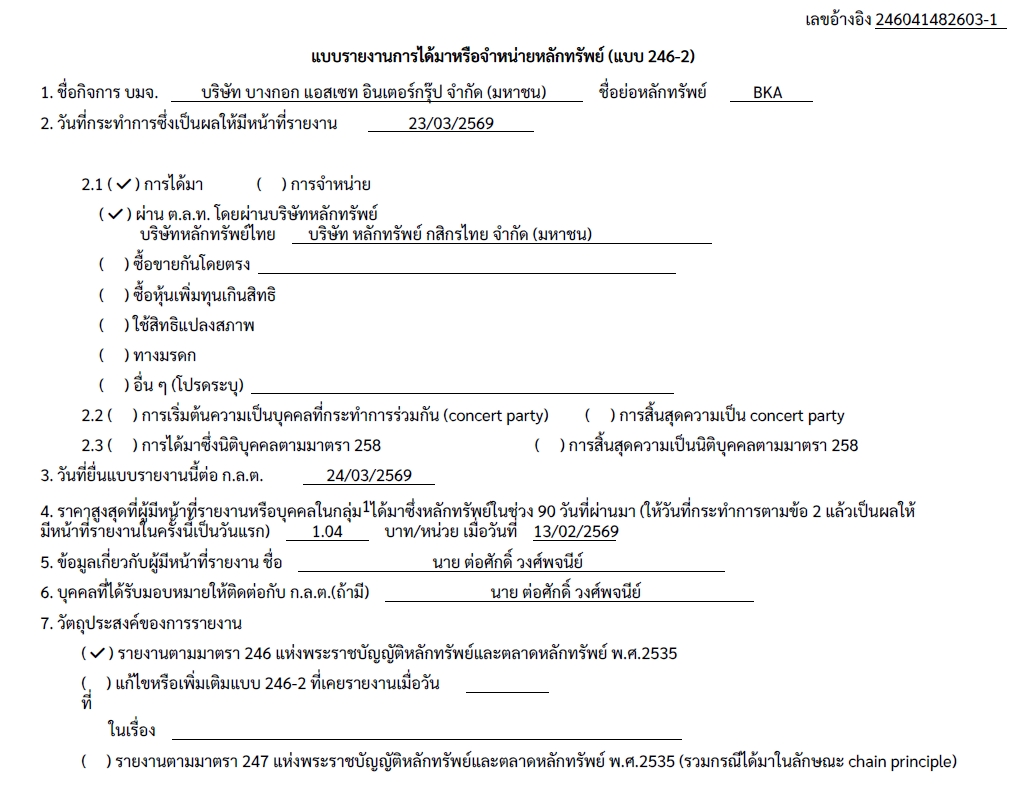 ผู้สื่อข่าวรายงานว่า วันนี้ (24 มีนาคม 2569) สำนักงานคณะกรรมการกำกับหลักทรัพย์และตลาดหลักทรัพย์ (ก.ล.ต.) เปิดเผยข้อมูลผ่านแบบ 246-2 ว่านายต่อศักดิ์ วงศ์พจนีย์ ได้รายงานการได้มาของหุ้น บริษัท บางกอก แอสเซท อินเตอร์กรุ๊ป จำกัด (มหาชน) หรือ BKA เมื่อวันที่ 23 มีนาคม 2569