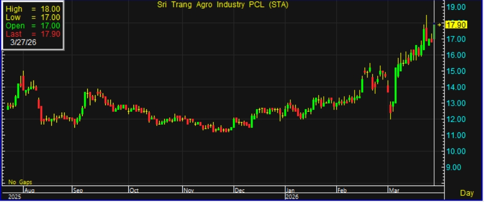ผู้สื่อข่าวรายงานว่า วันนี้ (27 มี.ค.69) ราคาหุ้น บริษัท ศรีตรังแอโกรอินดัสทรี จำกัด (มหาชน) หรือ STA ณ เวลา 11:39 น. อยู่ที่ระดับ 17.90 บาท บวก 1.10 บาท หรือ 6.55% สูงสุดที่ระดับ 18.00 บาท ต่ำสุดที่ระดับ 17.00 บาท ด้วยมูลค่าการซื้อขาย 316.67 ล้านบาท