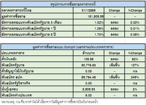 “บลจ.-ประกัน” กวาดซื้อตราสารหนี้ไทย 7.6 หมื่นล้านบาท “ต่างชาติ” เทขาย 4.3 พันล้านบาท โดย Yield พันธบัตรอายุ 5 ปี ปิดที่ 1.7% ปรับตัวลดลงจากเมื่อวาน -0.08%