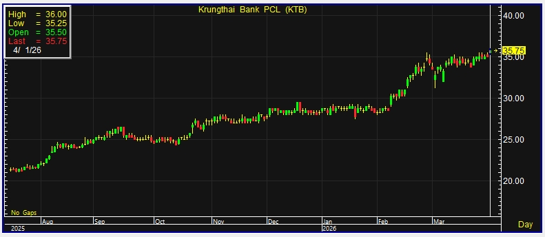 ผู้สื่อข่าวรายงานว่า วันนี้ (1 เม.ย.69) ราคาหุ้น ธนาคารกรุงไทย จำกัด (มหาชน) หรือ KTB ณ เวลา 10:07 น. อยู่ที่ระดับ 35.75 บาท บวก 0.75 บาท หรือ 2.14% ราคาสูงสุด 36 บาท ราคาต่ำสุด 35.25 บาท ด้วยมูลค่าซื้อขาย 1,059.19 ล้านบาท