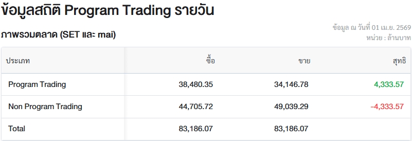 ผู้สื่อข่าวรายงานว่า วันนี้ (1 เม.ย.69) ตลาดหลักทรัพย์แห่งประเทศไทย (ตลท.) เปิดเผยข้อมูลซื้อขายรายวันผ่าน Program Trading หรือ “โปรแกรมโรบอทเทรดดิ้ง” พบว่ามีมูลค่าซื้อจำนวน 38,480.35 ล้านบาท และมูลค่าขายจำนวน 34,146.78 ล้านบาท เท่ากับซื้อสุทธิ 4,333.57 ล้านบาท