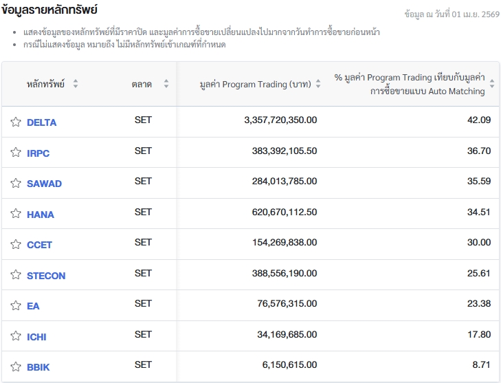 โดย บริษัทเดลต้า อีเลคโทรนิคส์ (ประเทศไทย) จำกัด (มหาชน) หรือ DELTA มีมูลค่าการซื้อขายผ่าน Program Trading จำนวน 3,357.72 ล้านบาท คิดเป็น 42.09% ของมูลค่าการซื้อขายแบบ Auto Matching ซึ่งอยู่ที่ 7,983.80 ล้านบาท