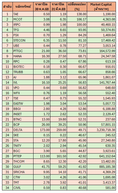 ส่อง 34 หุ้น ราคาพุ่งเกิน 40% ไตรมาส 1 ฟาก TAE-MCOT-IRPC ทะยานกว่าเท่าตัว!