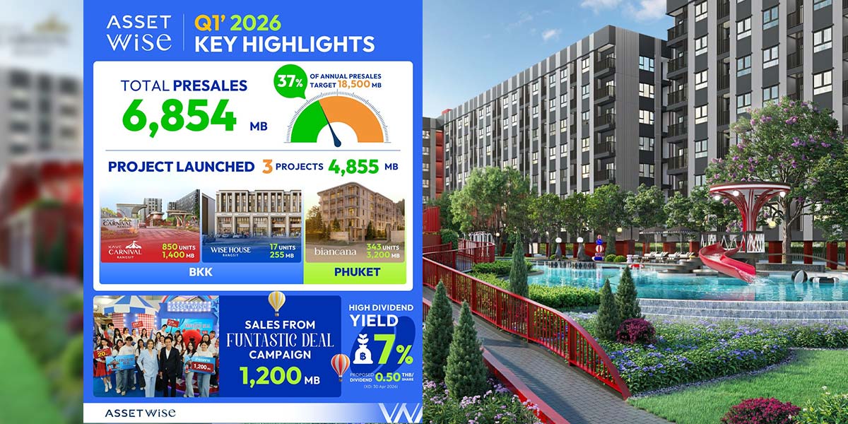นายกรมเชษฐ์ วิพันธ์พงษ์ ประธานเจ้าหน้าที่บริหาร บริษัท แอสเซทไวส์ จำกัด (มหาชน) หรือ ASW เปิดเผยว่า ท่ามกลางสถานการณ์เศรษฐกิจที่มีความท้าทายรอบด้าน บริษัทฯ ยังสามารถรักษาเสถียรภาพของผลการดำเนินงานให้อยู่ในระดับที่น่าพอใจ โดยในช่วงไตรมาสแรกของปี 2569 (มกราคม-มีนาคม) สามารถทำยอดขายจากโครงการบ้านและคอนโดมิเนียมได้รวมทั้งสิ้น 6,854 ล้านบาท เติบโตขึ้น 16% เมื่อเทียบกับไตรมาสก่อนหน้า ซึ่งคิดเป็นสัดส่วน 37% ของเป้าหมายยอดขายรวมทั้งปีที่ตั้งไว้ในระดับ 18,500 ล้านบาท