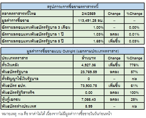 ภาพรวมของตลาดในวันนี้ เส้นอัตราผลตอบแทน (Yield Curve) ปรับตัวเพิ่มขึ้นจากวันก่อนหน้าประมาณ 0.02%-0.03% ในกลุ่มตราสารระยะยาว หลังจากที่ประธานาธิบดีโดนัลด์ ทรัมป์ ของสหรัฐอเมริกา ได้ออกมาแถลงว่าสถานการณ์สงครามจะยังคงดำเนินต่อไปอีกประมาณ 2-3 สัปดาห์ พร้อมกับเน้นย้ำว่าสงครามครั้งนี้จะจบลงในไม่ช้า ปัจจัยดังกล่าวส่งผลให้สัญญาน้ำมันดิบเวสต์เท็กซัส (WTI) ปรับตัวเพิ่มขึ้น 4.1% และสัญญาน้ำมันดิบเบรนท์ (Brent) ปรับตัวเพิ่มขึ้น 5%