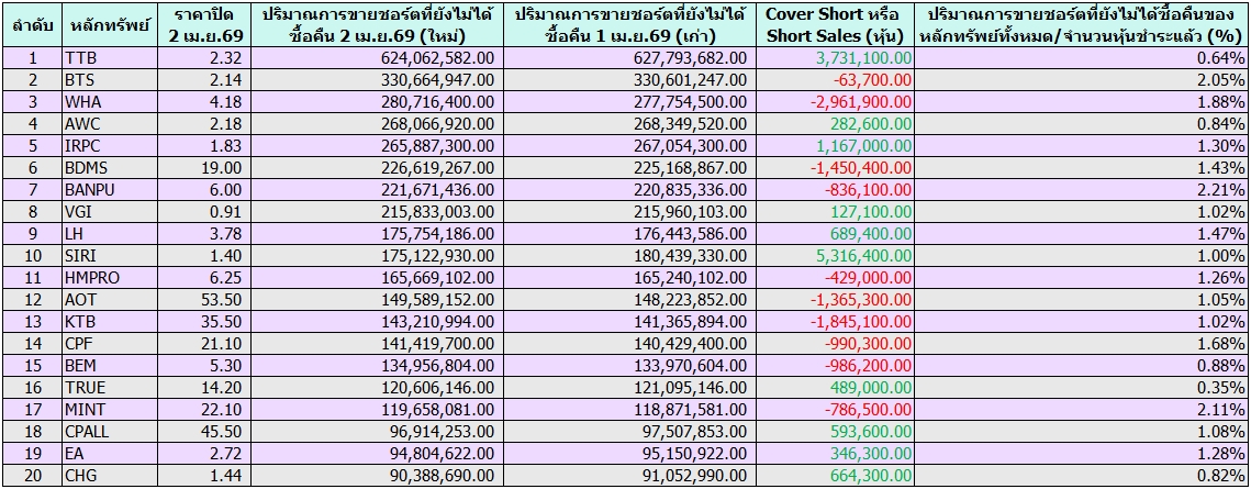 ข้อมูลสิ้นสุด 2 เม.ย.69 พบ TTB มีปริมาณชอร์ตคงค้างเหลือมากสุด 624 ล้านหุ้น คิดเป็น 0.64% ส่วน SIRI ถูก Cover Short สูงสุด 5 ล้านหุ้น ขณะที่ WHA ถูก Short Sales สูงสุด 2 ล้านหุ้น
