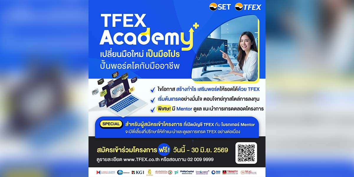 โครงการ TFEX Academy+ ชวนเรียนรู้การใช้ TFEX เสริมพอร์ต ใช้ได้ทุกสภาวะตลาด ตอบโจทย์ทุกสไตล์การลงทุน มือใหม่ก็เริ่มได้ สมัครฟรี! วันนี้-30 มิ.ย. 69