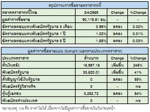 สำหรับภาพรวมของตลาดตราสารหนี้ในวันนี้ เส้นอัตราผลตอบแทน (Yield Curve) ปรับตัวลดลงจากวันก่อนหน้าประมาณ 0.02% – 0.05% ด้านปัจจัยต่างประเทศ เอสแอนด์พี โกลบอล (S&P Global) ได้รายงานดัชนีผู้จัดการฝ่ายจัดซื้อ (PMI) ภาคบริการของประเทศจีนประจำเดือนมีนาคม ปรับตัวลดลงสู่ระดับ 52.1 ซึ่งต่ำกว่าที่นักวิเคราะห์คาดการณ์ไว้ที่ระดับ 53.6 ขณะที่รายงานตัวเลขผู้ยื่นขอสวัสดิการว่างงานครั้งแรกของสหรัฐอเมริกา ปรับตัวลดลง 9,000 ราย สู่ระดับ 202,000 ราย ซึ่งต่ำกว่าตัวเลขคาดการณ์ของนักวิเคราะห์ที่ระดับ 212,000 ราย