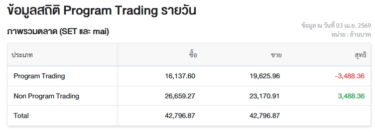 ผู้สื่อข่าวรายงานว่า วันนี้ (3 เม.ย.69) ตลาดหลักทรัพย์แห่งประเทศไทย (ตลท.) เปิดเผยข้อมูลซื้อขายรายวันผ่าน Program Trading หรือ “โปรแกรมโรบอทเทรดดิ้ง” พบว่ามีมูลค่าซื้อจำนวน 16,137.60 ล้านบาท และมูลค่าขายจำนวน 19,625.96 ล้านบาท เท่ากับขายสุทธิ 3,488.36 ล้านบาท