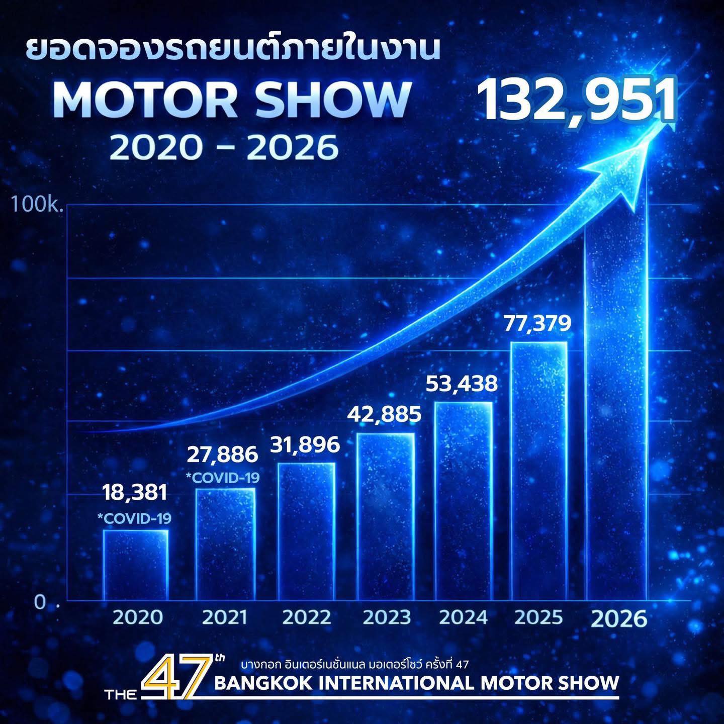 ผู้สื่อข่าวรายงานว่า งาน Bangkok International Motor Show ครั้งที่ 47 ซึ่งจัดโดยบริษัท กรังด์ปรีซ์ อินเตอร์เนชั่นแนล จำกัด (มหาชน) หรือ GPI ระหว่างวันที่ 25 มีนาคม-5 เมษายน 2569 ปิดฉากลงด้วยบรรยากาศคึกคัก โดยปีนี้สามารถสร้างยอดจองรถยนต์ภายในงานได้รวม 132,951 คัน ทำสถิติสูงสุดใหม่ เพิ่มขึ้น 71% จากปี 2568 ที่มียอดจอง 77,379 คัน ขณะที่ยอดจองรถจักรยานยนต์อยู่ที่ 2,056 คัน และมีผู้เข้าชมงานรวมทั้งสิ้น 1,798,312 คน
