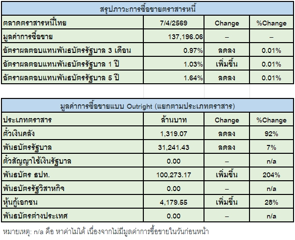 สมาคมตลาดตราสารหนี้ไทย (ThaiBMA) สรุปภาวะตลาดตราสารหนี้ไทยประจำวันนี้มีมูลค่าการซื้อขายรวมทั้งวันอยู่ที่ 137,196 ล้านบาท ด้านประเภทของนักลงทุน ที่มีมูลค่าการซื้อขายสูงที่สุด 2 อันดับแรก คือ 1. กลุ่มบริษัทหลักทรัพย์จัดการกองทุน (บลจ.) ซื้อสุทธิ 73,517 ล้านบาท 2. กลุ่มบริษัทประกัน ซื้อสุทธิ 615 ล้านบาท ในขณะที่นักลงทุนต่างชาติ ขายสุทธิ 449 ล้านบาท ส่วน Yield พันธบัตรอายุ 5 ปี ปิดที่ 1.64% ปรับตัวลดลงจากเมื่อวาน -0.01%