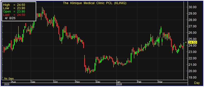 สื่อข่าวรายงานว่า วันนี้ (8 เม.ย.69) ราคาหุ้น บริษัท เดอะคลีนิกค์ คลินิกเวชกรรม จำกัด (มหาชน) หรือ KLINIQ ณ เวลา 11:11 น. อยู่ที่ระดับ 24.50 บาท บวก 0.80 บาท หรือ 3.38% ราคาสูงสุด 24.60 บาท ราคาต่ำสุด 23.90 บาท ด้วยมูลค่าซื้อขาย 1.76 ล้านบาท