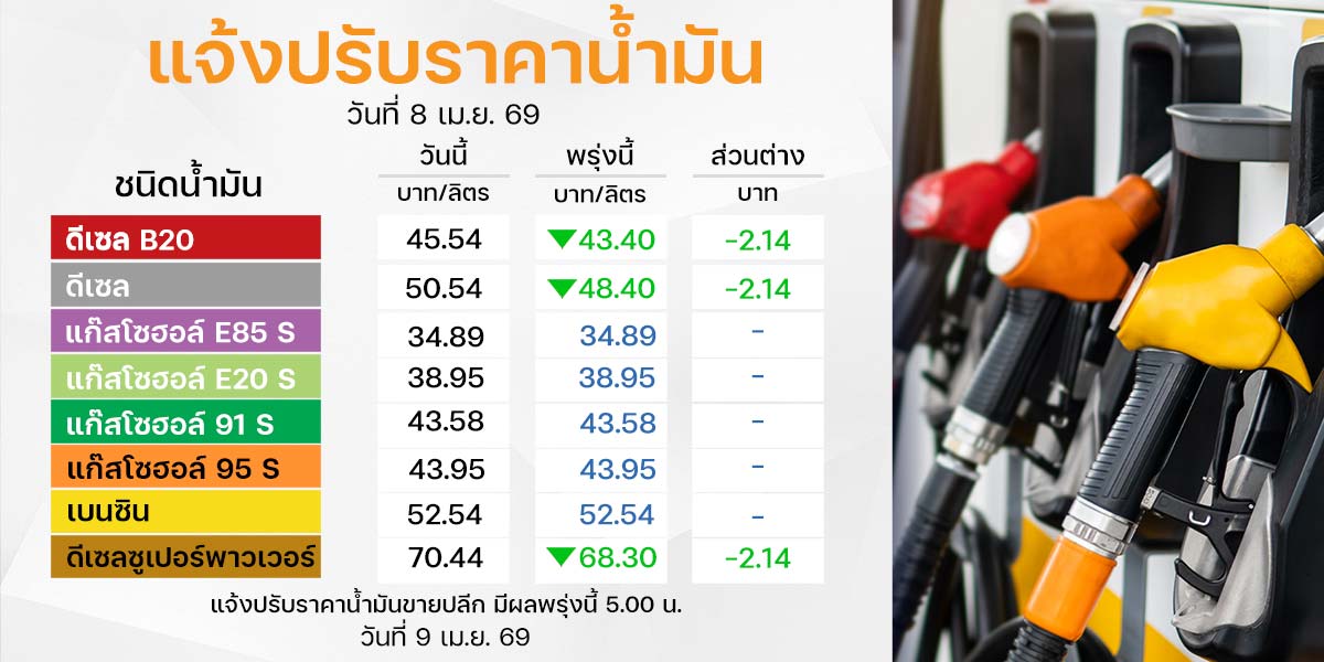 ทั้งนี้ มีผลตั้งแต่เวลา 05.00 น. วันที่ 9 เม.ย. 69 ส่งผลให้ราคาน้ำมันขายปลีกในพื้นที่กรุงเทพฯ ที่ยังไม่รวมภาษีบำรุงท้องถิ่นพรุ่งนี้ เป็นดังนี้
