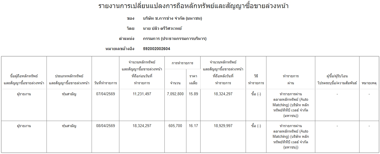 ผู้สื่อข่าวรายงานว่า รายงานจากสำนักงานคณะกรรมการกำกับหลักทรัพย์และตลาดหลักทรัพย์ (ก.ล.ต.) เปิดเผยข้อมูลแบบรายงานการเปลี่ยนแปลงการถือหลักทรัพย์และสัญญาซื้อขายล่วงหน้าของผู้บริหาร (แบบ 59) ประจำวันที่ 9 เม.ย.2569 พบรายการเคลื่อนไหวสำคัญของหุ้น บริษัท ช.การช่าง จำกัด (มหาชน) หรือ CK