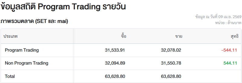 ผู้สื่อข่าวรายงานว่า วันนี้ (9 เม.ย.69) ตลาดหลักทรัพย์แห่งประเทศไทย (ตลท.) เปิดเผยข้อมูลซื้อขายรายวันผ่าน Program Trading หรือ “โปรแกรมโรบอทเทรดดิ้ง” พบว่ามีมูลค่าซื้อจำนวน 31,533.91 ล้านบาท และมูลค่าขายจำนวน 32,078.02 ล้านบาท เท่ากับขายสุทธิ 544,11 ล้านบาท
