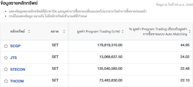 นอกจากนี้ ตลาดหลักทรัพย์แห่งประเทศไทย (ตลท.) รายงานข้อมูลหลักทรัพย์ที่มีการซื้อขายผ่านระบบ Program Trading สูงสุด โดยพิจารณาจากสัดส่วนมูลค่า Program Trading เทียบกับมูลค่าการซื้อขายแบบ Auto Matching พบว่ามี หลักทรัพย์ที่มีการทำรายการสูงสุดในวันนี้ ได้แก่