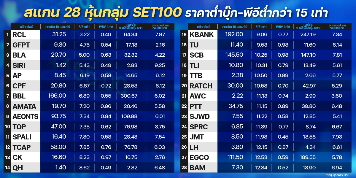 โดยจากการสำรวจข้อมูลการซื้อขายหลักทรัพย์ ณ วันที่ 10 เมษายน 2569 พบว่า มีหุ้นในกลุ่ม SET100 จำนวน 28 หลักทรัพย์ ที่เข้าเกณฑ์ราคาต่ำบุ๊กและ P/E ต่ำกว่า 15 เท่า โดยกลุ่มที่มีค่า P/E ต่ำที่สุด 5 อันดับแรก ได้แก่