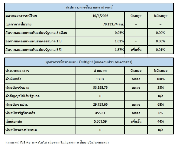 สมาคมตลาดตราสารหนี้ไทย(ThaiBMA) สรุปภาวะตลาดตราสารหนี้ไทยประจำวันนี้ มีมูลค่าการซื้อขายรวมทั้งวันอยู่ที่ 70,134 ล้านบาท ด้านประเภทของนักลงทุน ที่มีมูลค่าการซื้อขายสูงที่สุด 2 อันดับแรก คือ 1. กลุ่มบริษัทหลักทรัพย์จัดการกองทุน (บลจ.) ซื้อสุทธิ 3,580 ล้านบาท 2. กลุ่มบริษัทประกัน ซื้อสุทธิ 926 ล้านบาท ในขณะที่นักลงทุนต่างชาติ ขายสุทธิ 11,710 ล้านบาท Yield พันธบัตรอายุ 5 ปี ปิดที่ 1.57% ปรับตัวเพิ่มขึ้นจากเมื่อวาน +0.01%