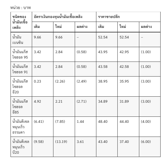 โดยการปรับลดครั้งนี้ถือเป็นความตั้งใจของกระทรวงพลังงานที่ต้องการดูแลค่าขนส่งและค่าครองชีพของพี่น้องประชาชนในช่วงจังหวะที่ราคาน้ำมันโลกเอื้ออำนวย การดำเนินการในครั้งนี้ส่งผลให้กองทุนน้ำมันเชื้อเพลิงแบกรับค่าใช้จ่ายวันละ 589.15 ล้านบาท จากเดิมที่เคยมีรายจ่ายกว่าวันละ 1,200 ล้านบาท