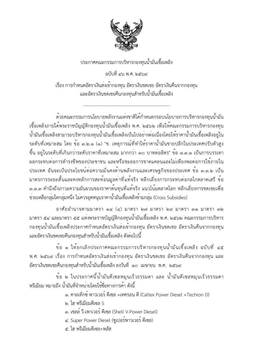 ข้อ 1 ให้ยกเลิกประกาศคณะกรรมการบริหารกองทุนน้ำมันเชื้อเพลิง ฉบับที่ 45 พ.ศ. 2569 เรื่อง การกำหนดอัตราเงินส่งเข้ากองทุน อัตราเงินชดเชย อัตราเงินคืนจากกองทุน และอัตราเงินชดเชยคืนกองทุนสำหรับน้ำมันเชื้อเพลิง ลงวันที่ 10 เมษายน พ.ศ. 2569