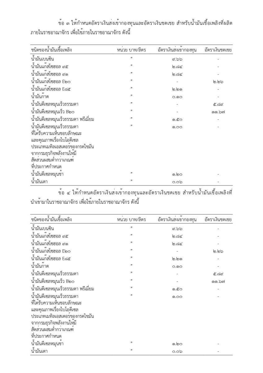 น้ำมันเบนซินอัตราเงินส่งเข้ากองทุน 9.66 บาท/ลิตร โดยไม่มีการชดเชย น้ำมันแก๊สโซฮอล์ 95 และ 91 ชดเชย 2.84 บาท/ลิตร ส่วน E20 ชดเชย 2.26 บาท/ลิตร
