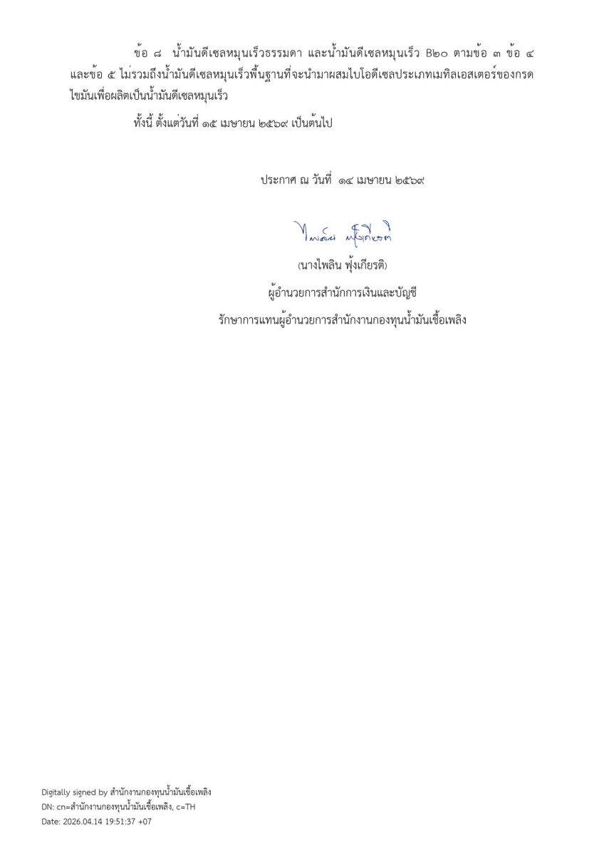 ผู้สื่อข่าวรายงานว่า วันนี้(14 เมษายน 2569) คณะกรรมการบริหารกองทุนน้ำมันเชื้อเพลิง (กบน.) ได้มีมติออกประกาศฉบับที่ 46/2569 เรื่องการกำหนดอัตราเงินส่งเข้ากองทุน อัตราเงินชดเชย อัตราเงินคืน และอัตราเงินชดเชยคืนสำหรับน้ำมันเชื้อเพลิง