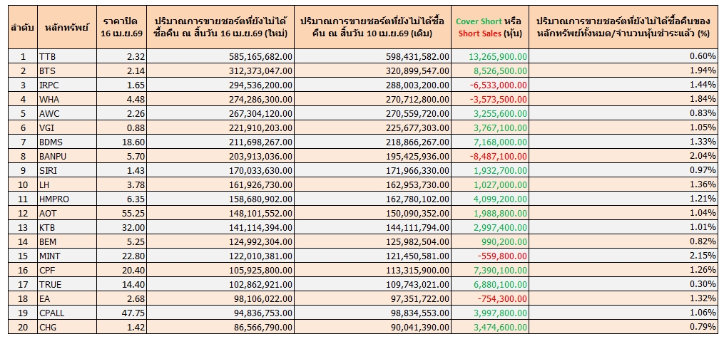 ข้อมูลสิ้นสุด 16 เม.ย.69 พบ TTB มีปริมาณชอร์ตคงค้างเหลือมากสุด 585 ล้านหุ้น คิดเป็น 0.60% และถูก Cover Short สูงสุด 13 ล้านหุ้น ขณะที่ BANPU ถูก Short Sales สูงสุด 8 ล้านหุ้น