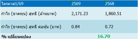 บริษัทฯ รายงานผลการดำเนินงานไตรมาส 1 ปี 2569 สิ้นสุดวันที่ 31 มีนาคม 2569 มีกำไรสุทธิ 2,171.23 ล้านบาท เพิ่มขึ้น 16.70% จากช่วงเดียวกันของปีก่อนที่มีกำไรสุทธิ 1,860.51 ล้านบาท โดยมีปัจจัยสนับสนุนจากการเติบโตของพอร์ตลูกหนี้บัตรเครดิตรวมและพอร์ตสินเชื่อบุคคล
