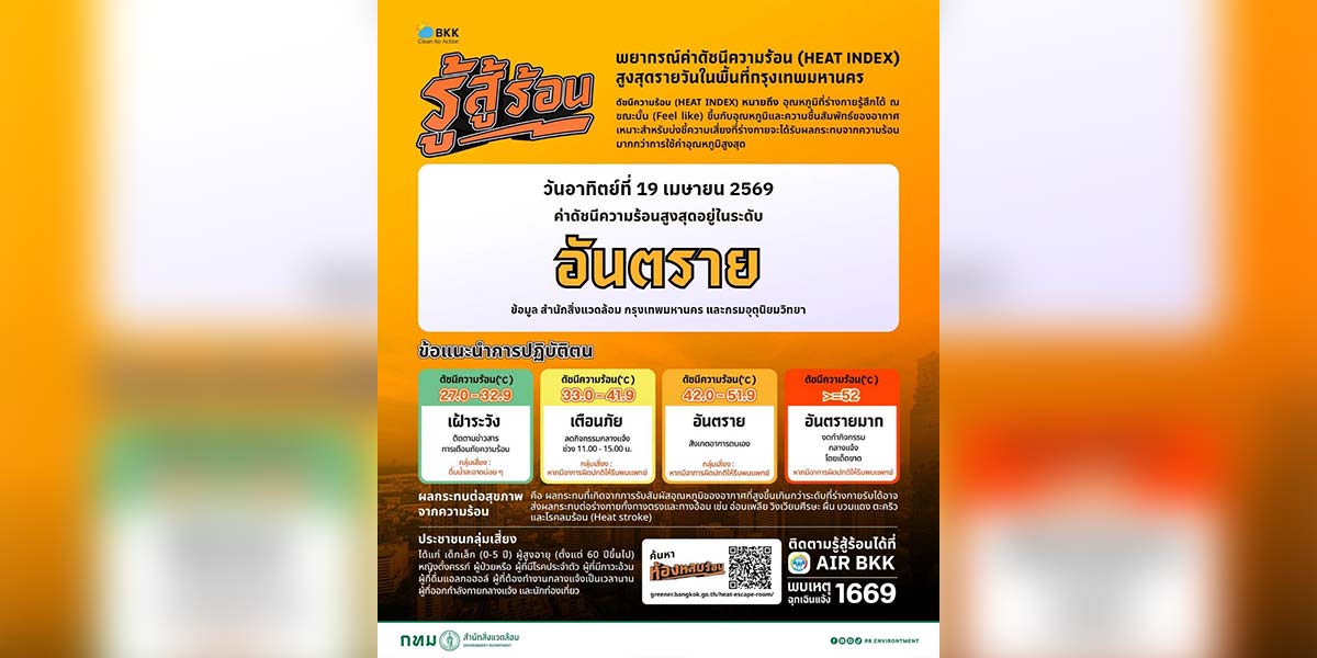 สำนักสิ่งแวดล้อม กรุงเทพมหานคร เปิดเผยถึงค่าดัชนีความร้อน (Heat Index) ประจำวันอาทิตย์ที่ 19 เมษายน 2569 โดยพบว่าค่าดัชนีความร้อนยังคงอยู่ในเกณฑ์ “อันตราย” ซึ่งเป็นระดับที่มีความต่อเนื่องมาตั้งแต่วันที่ 1 เมษายนที่ผ่านมาจนถึงปัจจุบัน พร้อมกันนี้ได้ประกาศเตือนให้ประชาชนทั่วไปหมั่นสังเกตอาการของตนเอง ขณะที่กลุ่มเสี่ยงหากพบอาการผิดปกติ ควรรีบไปพบแพทย์โดยทันที