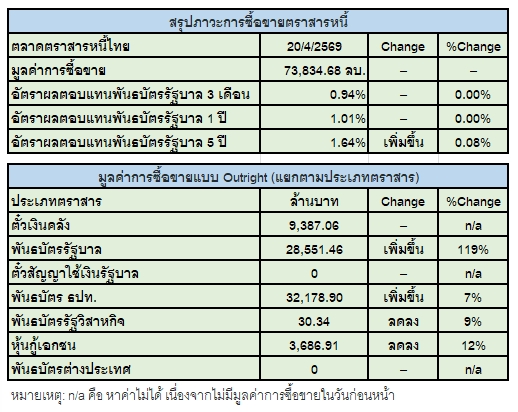 ผู้สื่อข่าวรายงานว่า สรุปภาวะตลาดตราสารหนี้ไทยประจำวันนี้ (20 เม.ย.69) มีมูลค่าการซื้อขายรวมทั้งสิ้น 73,835 ล้านบาท โดยกลุ่มนักลงทุนที่มีมูลค่าการซื้อขายสูงที่สุด 2 อันดับแรก ได้แก่ กลุ่มบริษัทหลักทรัพย์จัดการกองทุน (บลจ.) มียอดซื้อสุทธิ 12,883 ล้านบาท และกลุ่มบริษัทประกัน มียอดซื้อสุทธิ 3,413 ล้านบาท ในขณะที่นักลงทุนต่างชาติมียอดขายสุทธิ 1,801 ล้านบาท ทางด้านอัตราผลตอบแทนพันธบัตรรัฐบาล (Bond Yield) อายุ 5 ปี ปิดตลาดที่ระดับ 1.64% ปรับตัวเพิ่มขึ้น 0.08% จากวันก่อนหน้า