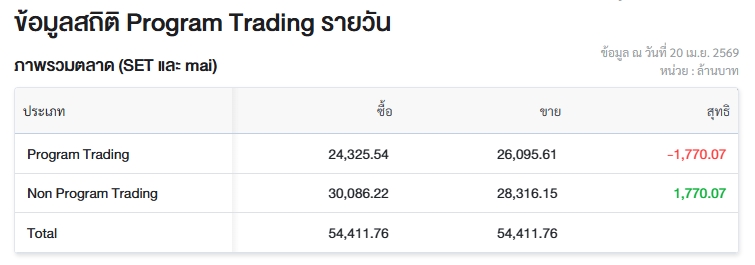 ผู้สื่อข่าวรายงานว่า วันนี้ (20 เม.ย.69) ตลาดหลักทรัพย์แห่งประเทศไทย (ตลท.) เปิดเผยข้อมูลซื้อขายรายวันผ่าน Program Trading หรือ “โปรแกรมโรบอทเทรดดิ้ง” พบว่ามีมูลค่าซื้อจำนวน 24,325.54 ล้านบาท และมูลค่าขายจำนวน 26,095.61 ล้านบาท เท่ากับขายสุทธิ 1,770.07 ล้านบาท