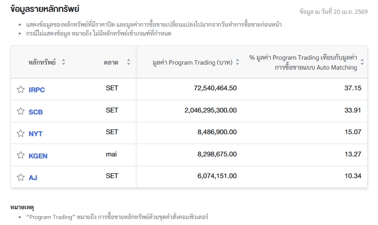 นอกจากนี้ ตลาดหลักทรัพย์แห่งประเทศไทย (ตลท.) รายงานข้อมูลหลักทรัพย์ที่มีการซื้อขายผ่านระบบ Program Trading สูงสุด โดยพิจารณาจากสัดส่วนมูลค่า Program Trading เทียบกับมูลค่าการซื้อขายแบบ Auto Matching พบว่ามี หลักทรัพย์ที่มีการทำรายการสูงสุดในวันนี้ ได้แก่
