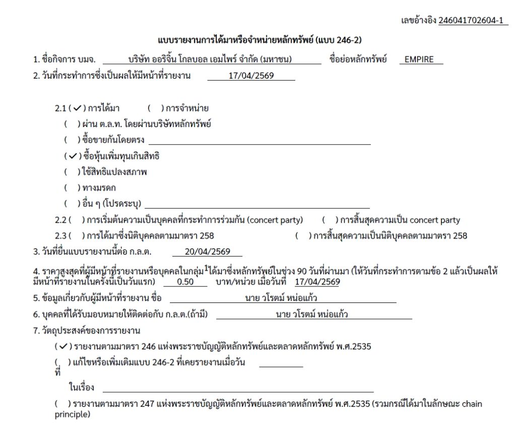 สำนักงานคณะกรรมการกำกับหลักทรัพย์และตลาดหลักทรัพย์ (ก.ล.ต.) เปิดเผยว่า ได้รับแบบรายงานการได้มาหรือจำหน่ายหลักทรัพย์ของกิจการ (แบบ 246-2) ลงวันที่ 20 เมษายน 2569 ซึ่งระบุว่า นายวโรตม์ หน่อแก้ว ได้เข้าซื้อหุ้นสามัญของบริษัท ออริจิ้น โกลบอล เอมไพร์ จำกัด (มหาชน) หรือ EMPIRE เมื่อวันที่ 17 เมษายน 2569 จำนวน 65,610,069 หุ้น คิดเป็นสัดส่วน 13.5278% ของสิทธิออกเสียงทั้งหมดของกิจการ โดยมีราคาเฉลี่ย 0.50 บาทต่อหุ้น มูลค่าการซื้อขาย 32.81 ล้านบาท