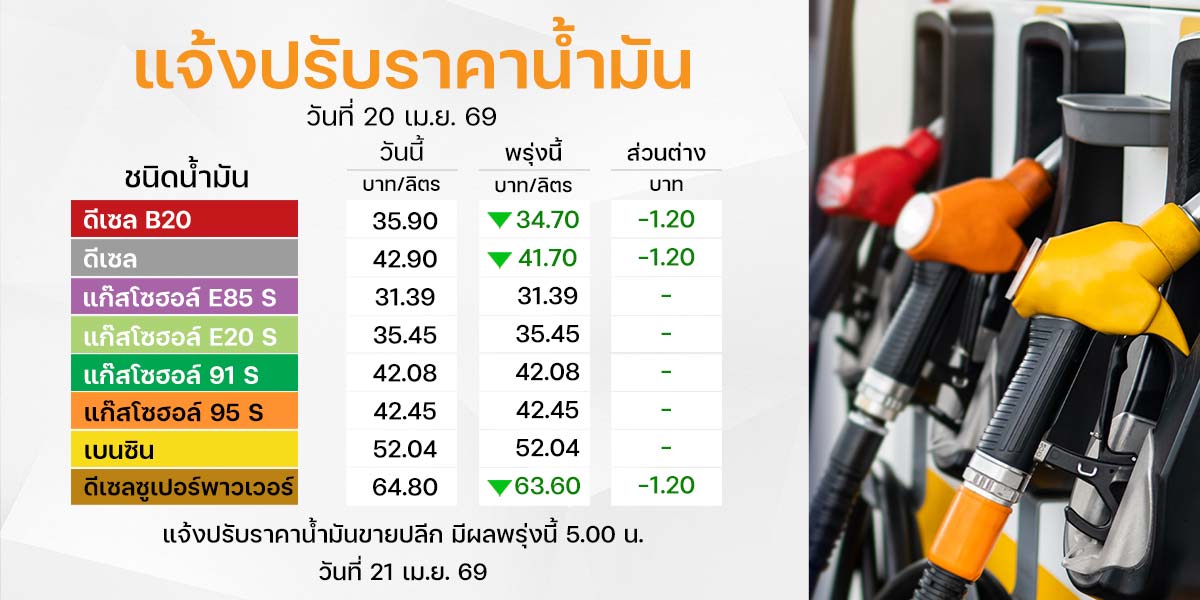 ทั้งนี้ ราคาดีเซล B20 ลดลงจาก 35.90 บาท/ลิตร เหลือ 34.70 บาท/ลิตร และดีเซลทั่วไปจาก 42.90 บาท/ลิตร เหลือ 41.70 บาท/ลิตร เช่นเดียวกับซูเปอร์พาวเวอร์ดีเซลที่ปรับลดจาก 64.80 บาท/ลิตร เหลือ 63.60 บาท/ลิตร
