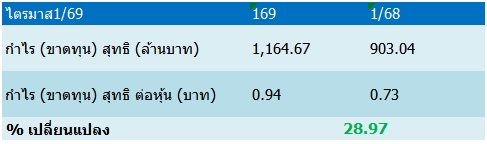 บริษัทฯ รายงานผลการดำเนินงานไตรมาส 1 ปี 2569 สิ้นสุดวันที่ 31 มีนาคม 2569 มีกำไรสุทธิจำนวน 1,164.67 ล้านบาท เพิ่มขึ้นร้อยละ 28.97 จากช่วงเดียวกันของปีก่อนมีกำไรสุทธิ 903.04 ล้านบาท