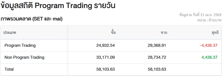 ขณะที่มูลค่าซื้อขายรายวันผ่าน Non Program Trading หรือ “การซื้อขายที่ไม่ใช่โปรแกรม” มีมูลค่าซื้อจำนวน 33,171.09 ล้านบาท และมูลค่าขายจำนวน 28,734.72 ล้านบาท เท่ากับซื้อสุทธิ 4,436.37 ล้านบาท