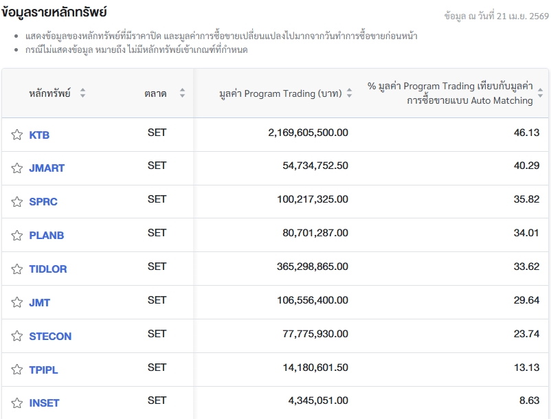 นอกจากนี้ ตลาดหลักทรัพย์แห่งประเทศไทย (ตลท.) รายงานข้อมูลหลักทรัพย์ที่มีการซื้อขายผ่านระบบ Program Trading สูงสุด โดยพิจารณาจากสัดส่วนมูลค่า Program Trading เทียบกับมูลค่าการซื้อขายแบบ Auto Matching พบว่ามี หลักทรัพย์ที่มีการทำรายการสูงสุดในวันนี้ ได้แก่