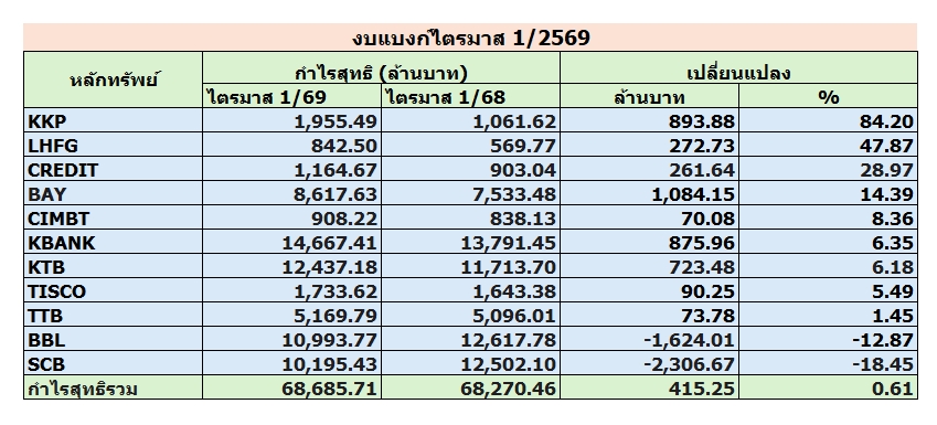 อย่างไรก็ดี หลายธนาคารยังสามารถรักษาการเติบโตของกำไรได้ จากแรงหนุนของรายได้ค่าธรรมเนียม รายได้ที่มิใช่ดอกเบี้ย การบริหารต้นทุน และคุณภาพสินทรัพย์ที่ยังอยู่ในเกณฑ์ควบคุมได้ โดยพบว่า มี 9 ธนาคาร ที่กำไรสุทธิไตรมาส 1/2569 เติบโตจากช่วงเดียวกันของปีก่อน ได้แก่ KKP, LHFG, CREDIT, BAY, CIMBT, KBANK, KTB, TISCO และ TTB ขณะที่ BBL และ SCB มีกำไรปรับตัวลดลง ดังตารางประกอบ