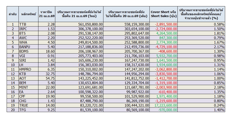 ข้อมูลสิ้นสุด 21 เม.ย.69 พบ TTB มีปริมาณชอร์ตคงค้างเหลือมากสุด 561 ล้านหุ้น คิดเป็น 0.58% และถูก Cover Short สูงสุด 17 ล้านหุ้น ส่วน BANPU ถูก Short Sales สูงสุด 5 ล้านหุ้น