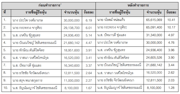 โดยล่าสุดบริษัทขอแจ้งให้ทราบว่าบริษัทได้จัดสรรหุ้นสามัญเพิ่มทุนของบริษัทเพื่อเสนอขายให้แก่ผู้ถือหุ้นเดิมตามสัดส่วนการถือหุ้น (Rights Offering) เรียบร้อยแล้ว โดยบริษัทได้รับชำระค่าหุ้นด้วยเงินสดเป็นจำนวนทั้งสิ้น72,750,000 บาท ในระหว่างระยะเวลาจองซื้อและชำระเงินวันที่ 3 เมษายน 2569–วันที่ 10 เมษายน 2569 และเมื่อวันที่ 17 เมษายน 2569 บริษัทได้จดทะเบียนเพิ่มทุนชำระแล้วของบริษัทจำนวน 72,750,000 บาท ต่อกรมพัฒนาธุรกิจการค้ากระทรวงพาณิชย์ เป็นที่เรียบร้อยแล้ว ส่งผลให้โครงสร้างการถือหุ้นและผู้ถือหุ้นรายใหญ่ของบริษัทมีการเปลี่ยนแปลงดังนี้