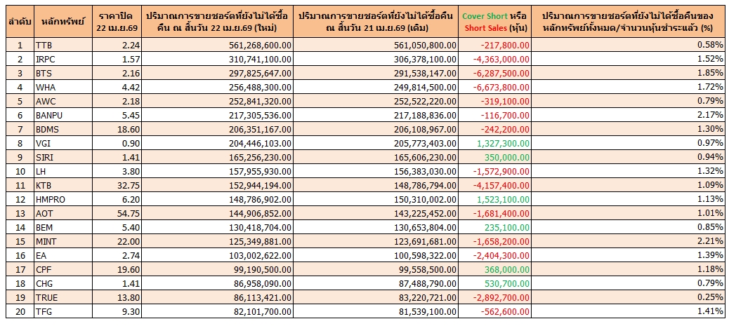 เปิด 20 อันดับหุ้นถูก “Cover-Short” สูงสุด ณ 22 เม.ย.69