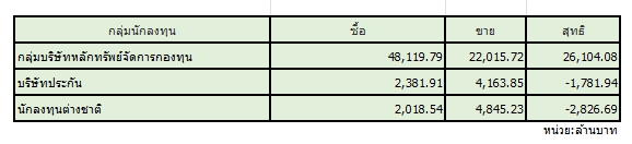 สมาคมตลาดตราสารหนี้ไทย (ThaiBMA) สรุปภาวะตลาดตราสารหนี้ไทยประจำวันนี้ มีมูลค่าการซื้อขายรวมทั้งวันอยู่ที่ 104,822 ล้านบาท ด้านประเภทของนักลงทุน ที่มีมูลค่าการซื้อขายสูงที่สุด 2 อันดับแรก คือ 1. กลุ่มบริษัทหลักทรัพย์จัดการกองทุน (บลจ.) ซื้อสุทธิ 26,104 ล้านบาท 2. กลุ่มบริษัทประกัน ขายสุทธิ 1,782 ล้านบาท ในขณะที่นักลงทุนต่างชาติ ขายสุทธิ 2,827 ล้านบาท