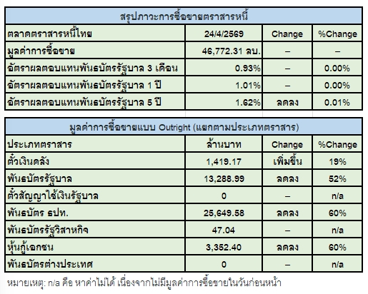 สำหรับภาพรวมของตลาดในวันนี้ เส้นอัตราผลตอบแทน (Yield Curve) ปรับตัวลดลงจากวันก่อนหน้าประมาณ 0.01-0.02% ขณะที่ปัจจัยต่างประเทศ เอสแอนด์พี โกลบอล (S&P Global) รายงานดัชนีผู้จัดการฝ่ายจัดซื้อ (PMI) รวมภาคการผลิตและภาคบริการเบื้องต้นของสหรัฐอเมริกา ปรับตัวขึ้นสู่ระดับ 52.0 ในเดือนเมษายน จากระดับ 50.3 ในเดือนมีนาคม โดยได้รับแรงหนุนจากคำสั่งซื้อใหม่และการจ้างงาน ขณะที่ความเชื่อมั่นของภาคธุรกิจปรับตัวดีขึ้น