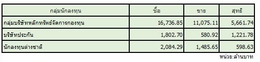 สมาคมตลาดตราสารหนี้ไทย (ThaiBMA) รายงานสรุปภาวะตลาดตราสารหนี้ไทยประจำวัน มีมูลค่าการซื้อขายรวมทั้งวันอยู่ที่ 46,772 ล้านบาท โดยประเภทของนักลงทุนที่มีมูลค่าการซื้อขายสูงที่สุด 2 อันดับแรก ได้แก่ กลุ่มบริษัทหลักทรัพย์จัดการกองทุน (บลจ.) มียอดซื้อสุทธิที่ 5,662 ล้านบาท รองลงมาคือ กลุ่มบริษัทประกัน มียอดซื้อสุทธิ 1,222 ล้านบาท ขณะที่นักลงทุนต่างชาติมียอดซื้อสุทธิอยู่ที่ 599 ล้านบาท ด้านอัตราผลตอบแทนพันธบัตรรัฐบาล (Yield) อายุ 5 ปี ปิดที่ระดับ 1.62% ปรับตัวลดลง 0.01% จากวันก่อนหน้า